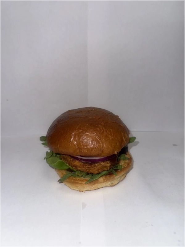 Brioche bun, kipburger, gemengde sla, BBQ saus en rode ui0