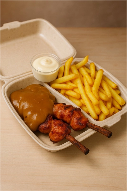 Portie friet, twee kipsaté stokjes samen 200 gram in satésaus met een bakje mayonaise0